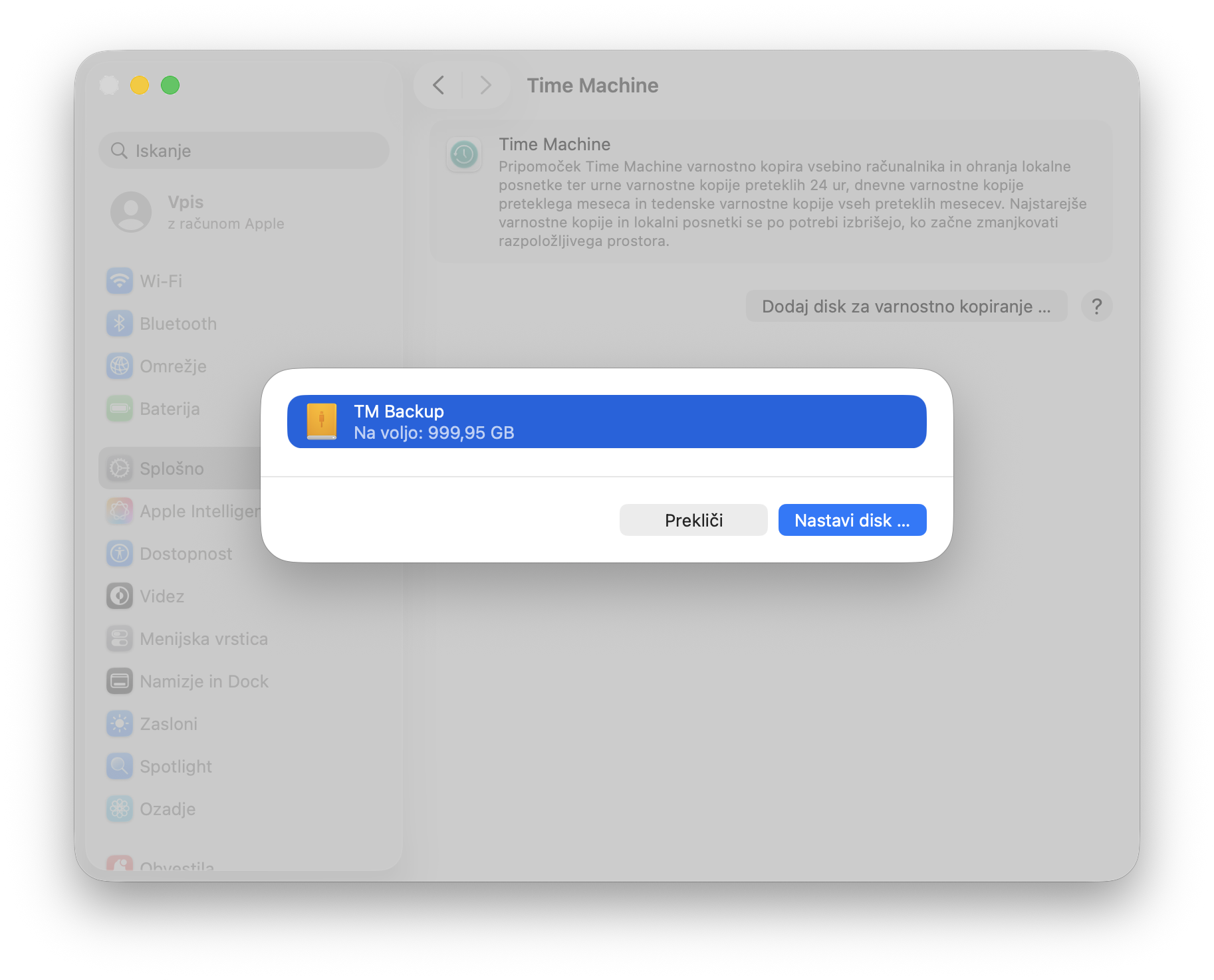 Če izbrani disk nima datotečnega sistema, ki ga zahteva Time Machine, boste pozvani k formatiranju (brisanju) diska. To storite le, če na disku še nimate nobenih pomembnih datotek.