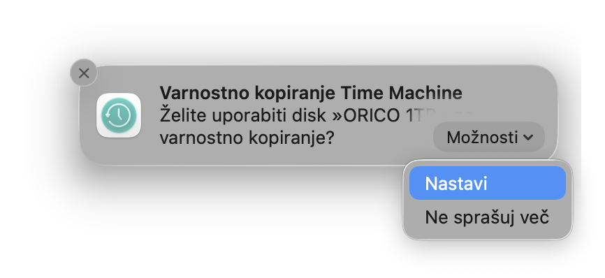 V primeru, da zunanji disk še ne uporablja Applovega datotečnega sistema, bo ob izbiri diska sistem predlagal formatiranje na pravi datotečni sistem, kar bo pobrisalo že obstoječe podatke s samega diska. Če na zunanjem disku že hranite datoteke, ki jih ne želite igubiti, nikakor ne smete izbrati te opcije. V tem primeru uporabite drug medij za izdelavo varnostne kopije ali datoteke na izbranem disku najprej shranite drugam.